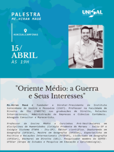 A palestra “Oriente Médio: A guerra e seus interesses” tem como objetivo analisar, sob uma perspectiva histórica e geopolítica, os conflitos que caracterizam a região. A proposta é promover uma reflexão crítica fundamentada sobre as dinâmicas que influenciam a instabilidade regional e seus desdobramentos globais.