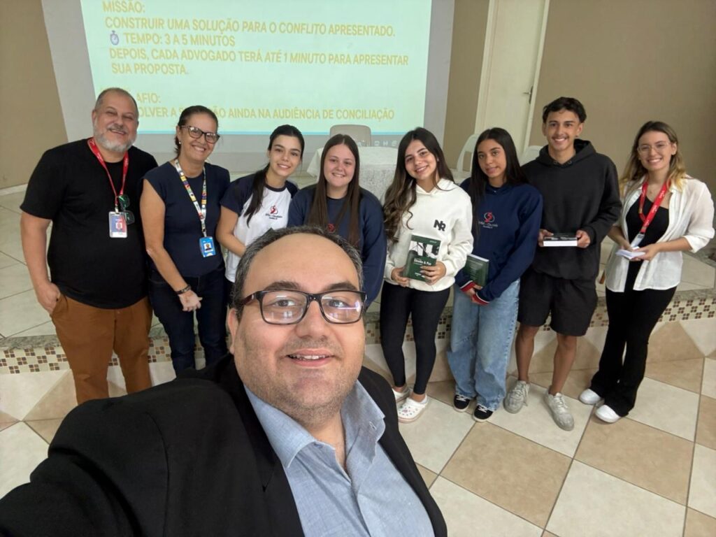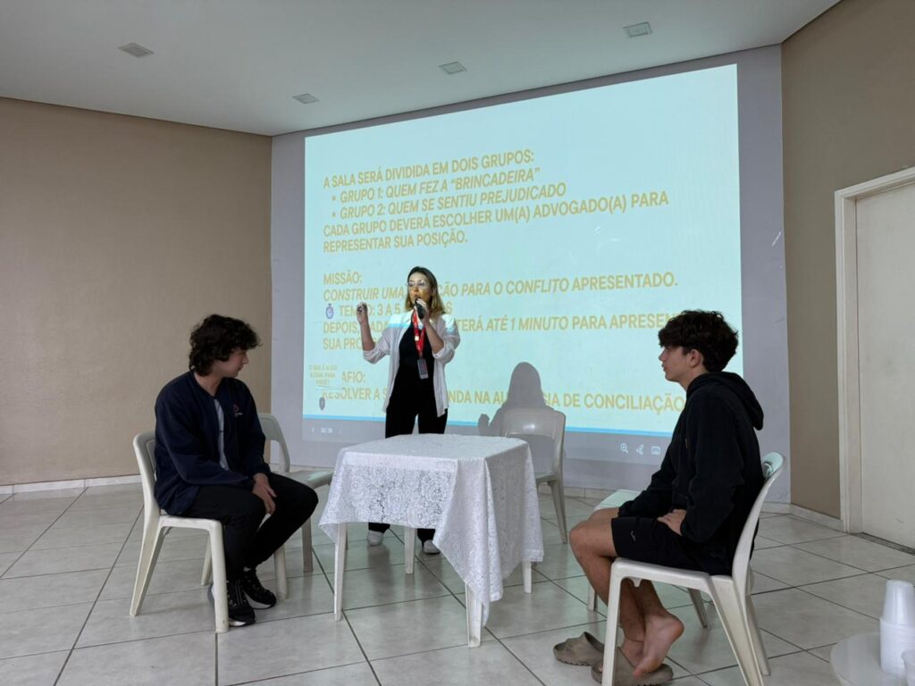 Durante o encontro, os estudantes participaram de um diálogo aberto sobre respeito, convivência e responsabilidade nas interações sociais. Em articulação com o Curso de Direito, também foi realizada uma simulação de audiência de conciliação, motivada por um conflito envolvendo bullying. A experiência possibilitou aos alunos compreender como situações aparentemente simples, vivenciadas no cotidiano escolar, podem evoluir e chegar ao Poder Judiciário, ampliando a percepção sobre consequências jurídicas e sociais de determinados comportamentos.