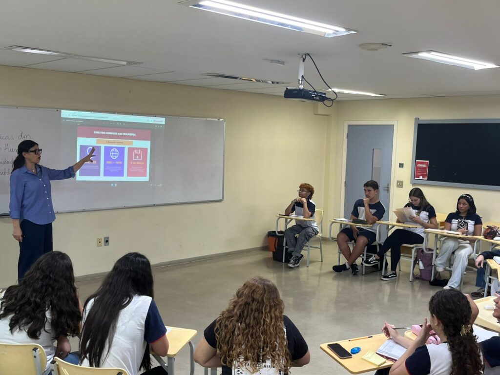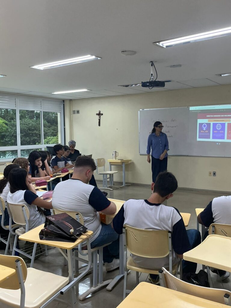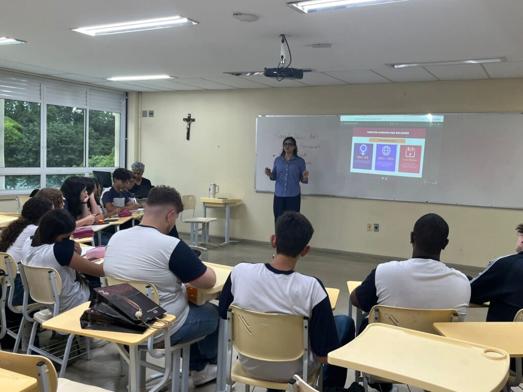 Outra ação de destaque foi a palestra ministrada pela professora Luzia Ragazini, que apresentou o tema “Direitos Humanos das Mulheres” a estudantes do segundo e terceiro anos do Ensino Médio do Colégio São Joaquim. A atividade integrou uma das etapas do projeto “Redação Nota 1000”, coordenado pela professora Marcilene Bueno, e teve como finalidade ampliar o repertório dos estudantes, contribuindo para a formação crítica e para o desenvolvimento da escrita dissertativa-argumentativa.