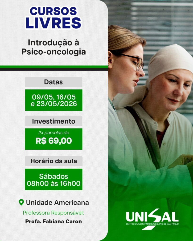 UNISAL Americana (Campus Maria Auxiliadora) está com inscrições abertas para o curso de Introdução à Psico-oncologia, voltado a estudantes e profissionais da Psicologia e demais áreas da Saúde que buscam conhecimentos e aperfeiçoamento em habilidades clínicas no suporte emocional ao paciente oncológico.